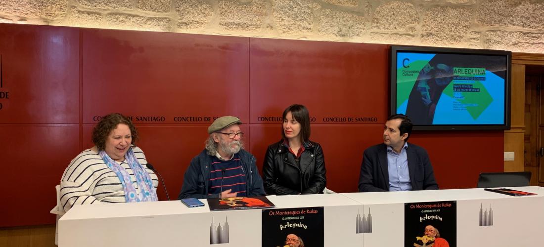 Os Monicreques de Kukas celebran o seu 40 aniversario como compañía e fano estreando ‘Arlequina’ no Teatro Principal. Será este xoves, 28 de marzo, ás 20.30 h e repetirán función para público familiar o venres 29 e o sábado 30, neste caso ás 18.30 h. Así o presentaron esta mañá a concelleira de Acción Cultural do Concello de Santiago, Branca Novoneyra; o director de AGADIC, Jacobo Sutil; e Isabel Rei e Marcelino de Santiago, Kukas, da compañía. As entradas teñen un prezo de 4 euros (o bono familiar de 12 euros inclúe catro entradas) e poden mercarse en compostelacultura.gal ou no despacho de billetes do Teatro Principal (aberto de 18 a 21 h ou 1h e media antes do evento).
